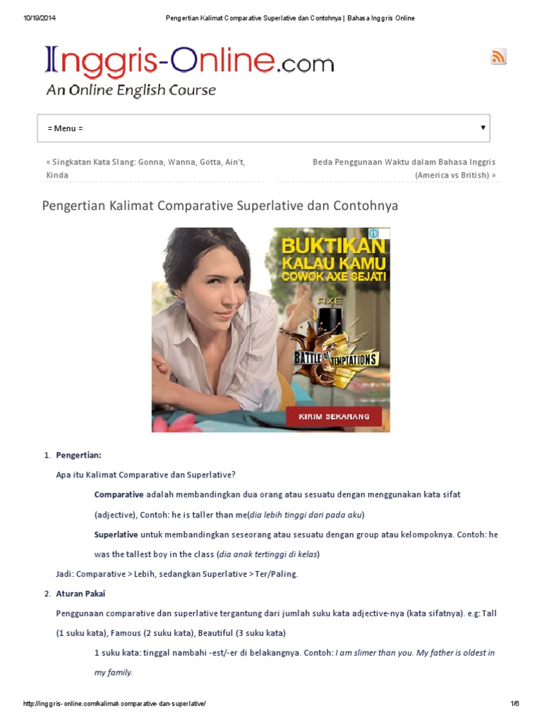 Contoh Kalimat Degree of Comparison (Positive, Comparative ... from englishcoo.com Yap, kita sudah membahas pengertian dan contoh kalimat degree of comparison baik itu positive, comparative maupun superlative. My mother said that she can contoh comparative degree: This is the best dress. My grades are lower than my sister's. A:what's the longest river in indonesia? Superlative adalah nama yang diberikan untuk grammar yang digunakan untuk membandingkan tiga atau lebih orang, benda, atau hal. Contoh kalimat comparative & superlative. Namun demikian, jangan lupa untuk menambahkan the sebelum adjective.
